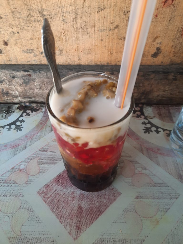 Saya memberhentikan sepeda dan menyimpannya di belakang. Duduk di bangku dan meminta 2 gelas es. Es Campur Mang Cawa bersampingan dengan Mi Ayam Mas Blangkon. Saya menerima gelas es campur. Mengaduk dan meminumnya. Ciri khas Es Campur Mang Cawa berupa kacang hijau dibalut dengan santan, sekuteng, dan gula aren. Bikin legit di mulut. Sekuteng yang berwarna jambon atau pink terbuat dari santan kelapa dan sagu. Setiap hari setidaknya habis 7 kilogram kacang hijau untuk satu gerobak Es Campur Mang Cawa.
