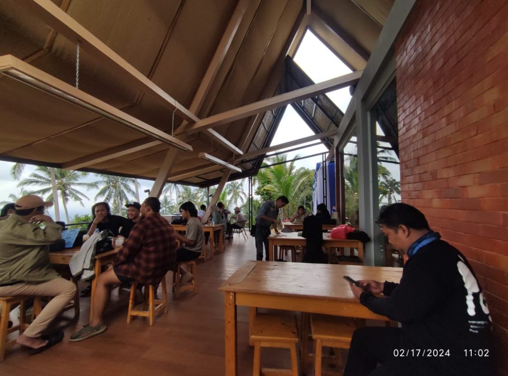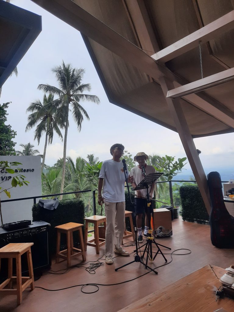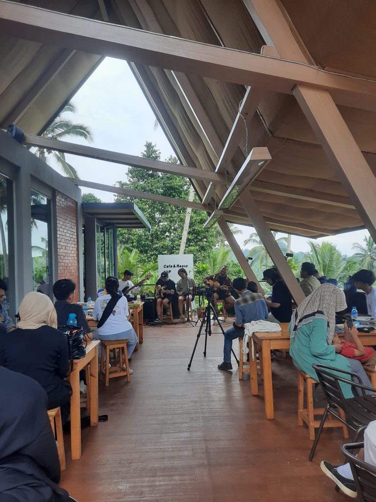 Tiga jam setelah lepas dari Nasi Uduk Prasmanan Ibu Iis dan berhenti di Es Campur Mang Cawa akhirnya kami tiba di Imah Kopi. Teman-teman Beranda Rumah dan Pandeglang Creative Hub serta pengunjung berbaur menjadi satu. Saya tidak kuat membawa sepeda naik tangga menuju beranda imah kopi. Jeni membantu. Ia selalu sigap. Juga mengambil foto. Selepas duhur Musik di Gunung dimulai. Dua pembawa acara berhasil mengajak pengunjung menikmati sajian musik.