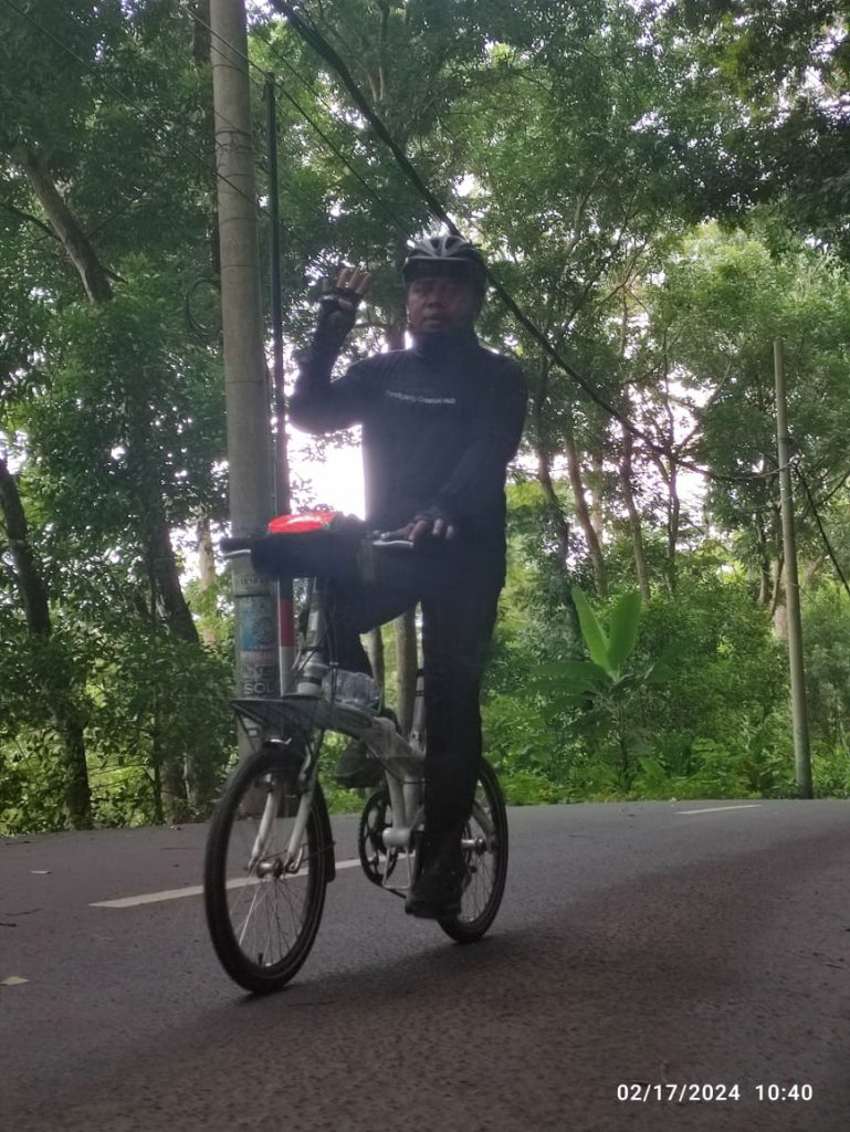 Pukul 08.00 WIB kami lepas dari Nasi Uduk Prasmanan Ibu Iis. Saya mengayuh sepeda di depan, Jeni di belakang. Sampai di Pertelon Warunggunung saya menukar sepeda ke Jeni. Saya mengayuh sepeda Laux Fiorentina ukuran 16 ternyata lebih melelahkan. Tukar dengan Pocket Rocket (20 inch) milik Jeni. Lumayan lebih ringan. Di perjalanan bertemu dengan Mas Sucipto yang menuju ke tujuan yang sama Gunung Karang. Mas Sucipto gowes dari Cikupa Tangerang. Kami sempat berbincang sebentar di perbatasan Lebak dan Pandeglang saat rehat minum. Setelah itu, beliau ngacir tak terkejar.